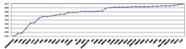 Más allá de considerar que existieron auges y podrían esbozarse las épocas reseñadas, si se toma en cuenta el año de creación de cada –considerando las 41 personas públicas no estatales actuales-, podría afirmarse que la tendencia de creación ha sido una constante, como lo refleja la siguiente gráfica: