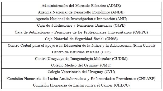 The goal of these few pages is to relieve the current nonstate public entities and those whose existence is passed. Cases of nationalization, in other words, cases in which businesses and / or activities in private hands were “absorbed” by the public sector will be analyzed. Moreover, cases of denationalization, those cases that correspond to “parts” of state powers, which are moved -for the very creation of the non- State public person in this area- will be discussed. In these cases, the goal is to try to visualize how the state continues involved in such activity falling apart, mentioning for it the people responsible for its management and/or administration and the controls to which they are subjected. No object of this work is the study of nature, organization, resources and other elements of non-state public entities, nor their distinction with the state public entities. Notwithstanding, a brief theoretical framework will be made. The methodology used for the survey mentioned was the review of doctrine and jurisprudence, as well as regulations related to the subject, using databases of IMPO and La Ley Uruguay. In all cases where one was found, the official website of each of these agencies was consulted.