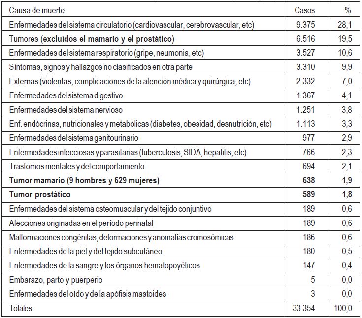 La tabla detalla las defunciones de 2012 en orden decreciente de cantidad de casos por causa de muerte junto con el porcentaje en función del total de muertes. Del total de muertes por tumores según el MSP (7.743) se desglosó el número de las ocasionadas por cáncer mamario y prostático brindado por la CHLCC (638 y 589 respectivamente) intercaladas y destacadas en el lugar correspondiente del ranking: posiciones 12ª y 13ª.