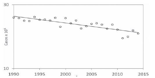 Otra información disponible es la tendencia de la mortalidad por cáncer de mama, la cual está en descenso desde 1990 en Uruguay [CHLCC 2, pág.7]. La gráfica siguiente en base a datos disponibles hasta 2014 inclusive es bien expresiva: